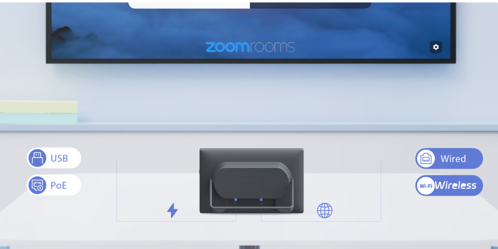 Two kinds of power supply modes: USB and PoE. The RT10 can connect video conferecing system through wired network or Wi-Fi.